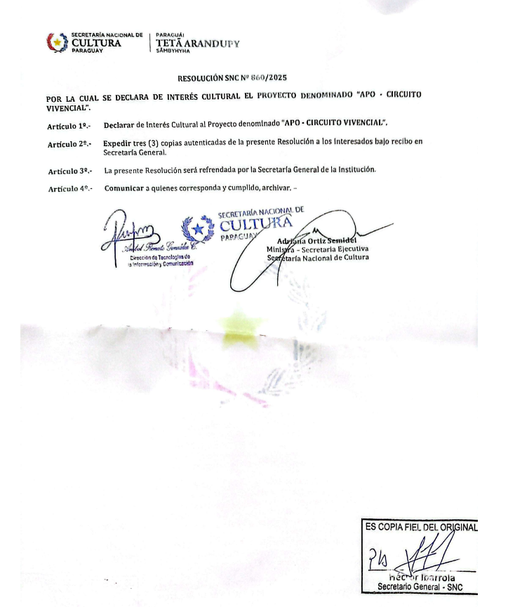 Iniciamos con buen pie el año 2026, en el mes de enero la Secretaría Nacional del Paraguay bajo la resolución núm 860/ 2025 declara Interés Cultural al proyecto APO- YAGUARÓN ORIGINARIO. Por tener como objetivo general el velar por la salvaguardia del patrimonio cultural inmaterial de Yaguarón y el bienestar de los/as artesanos/as sumado a artistas locales. Firmado por la Ministra de Cultura Adriana Ortiz Semidei.
